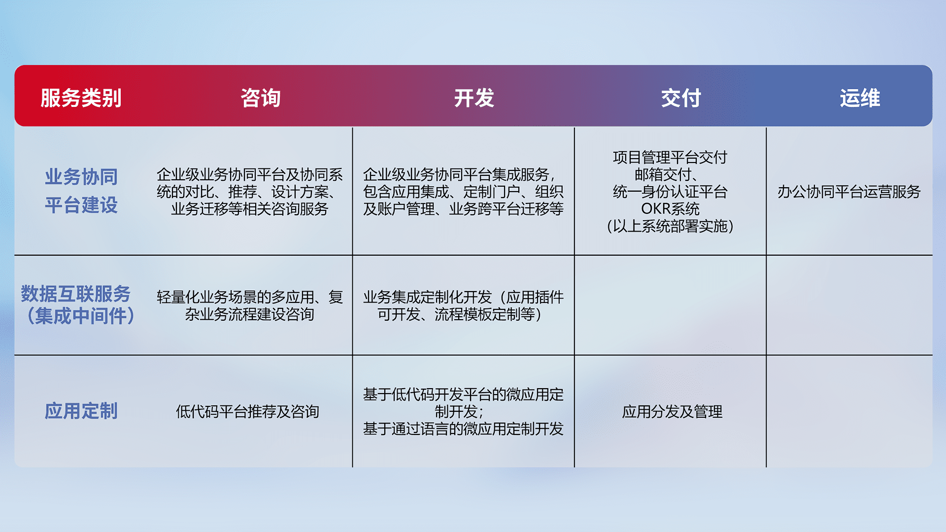 针对钉钉、、企微、、、IDaas等平台级产品提供产品的规划、、、、方案、、、、交付、、定制化开发等服务,,,,实现如统一协同办公、、智能客户服务、、、混合会议管理、、、、智能数据查询、、等业务场景,,实现数字化转型。。。